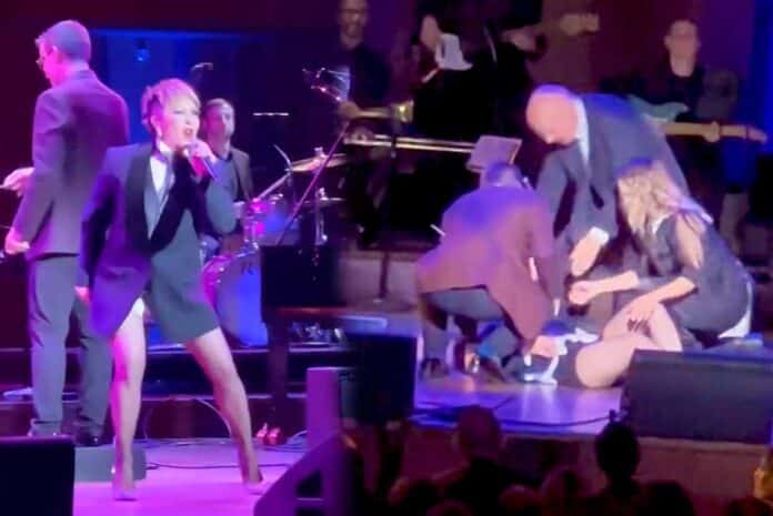 Alejandra Guzmán estaba interpretando la canción “Mala Hierba” cuando perdió el equilibrio, se cayó hacia atrás y quedó estirada en el escenario.#AlejandraGuzman pic.twitter.com/ruR0gI07dg
