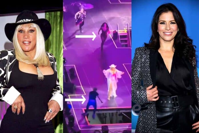 Pero en un momento dado, la cantante parece desorientarse mientras interpreta su éxito Suavecito, y en lugar de caminar hacia la izquierda del escenario, sigue derecho, directo hacia donde hay una enorme abertura en el piso que lleva a la parte inferior del entarimado, donde personal del staff trabaja controlando las luces y el sonido del show.