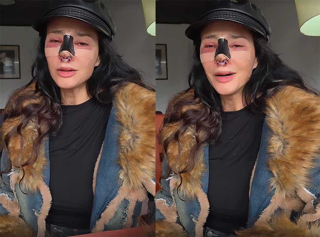 Un médico colombiano tomó el reto de reconstruirle la nariz a la modelo, describiendo en una historia de Instagram lo que presentaba al llegar a él. Fotos: Instagram / froilanpaez