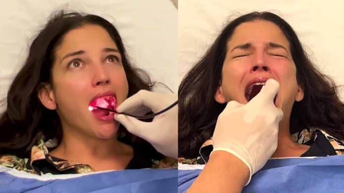 Un médico le examina la garganta y luego le practica una endoscopía nasal, así como una laringoscopía para examinar sus cuerdas vocales.