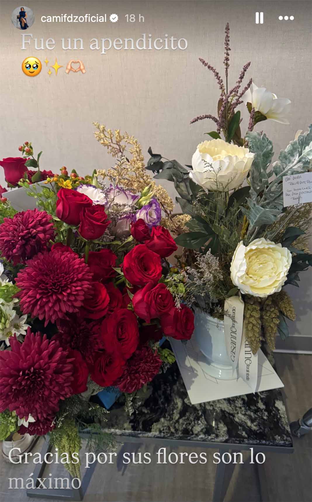 Más tarde Camila subió otra historia agradeciendo que le hayan enviado ramos de flores, y como si acabara de tener un bebé, escribió el mensaje: "Fue un apendicito".