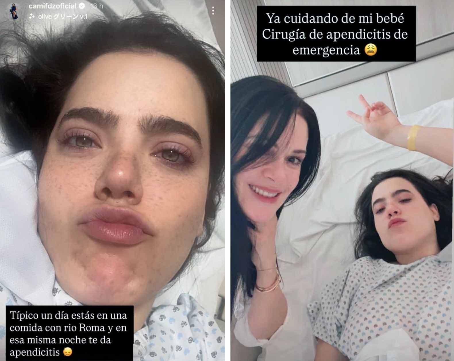 Camila Fernández y su madre, América Guinart, dieron a conocer en sus historias de Instagram la cirugía de emergencia de joven, debido a un apendicitis. Fotos: Instagram / camifdzoficial / meraguin